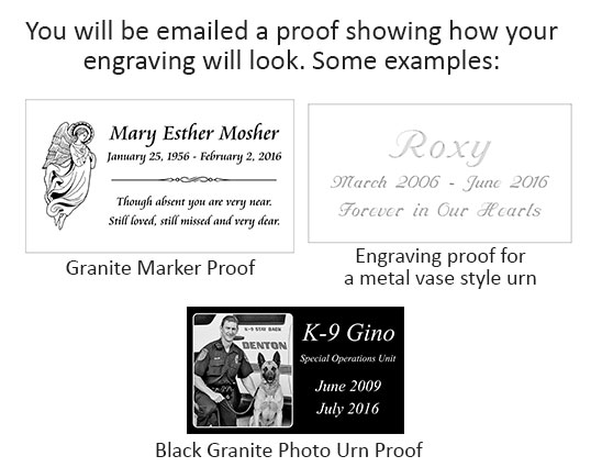 We will design your urn and email you a proof of what the side(s) will look like. The proof is typically emailed in less than 1-2 business days. At this time you can make any corrections you may need or approve it for engraving. Once the proof is approved by you, the urn is engraved within 1-2 business days and shipped. Click here to view a sample proof.